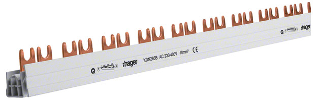 Aansluitrail vork 2-polig 10 mm² 56 modules. De installatie quickbusbar-rails (KDN) zorgen in combinatie met quickbusbar-componenten voor een snelle, veilige en schroefloze verbinding. Deze Quickbusbar aansluitrail is ten behoeve van 28 automaten, aardlekschakelaars of aardlekautomaten 2p.