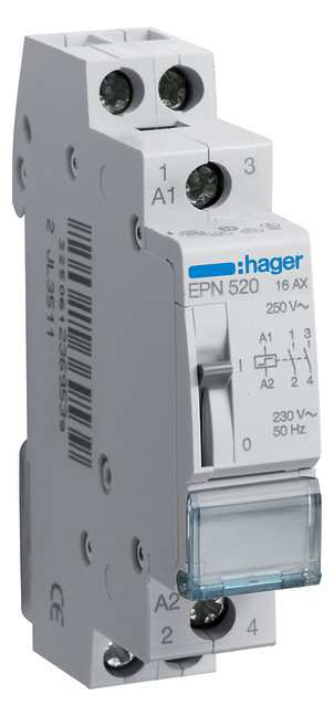 - Hager EPN bistabiel relais, (bxdxh) 18x70x86mm, spoelspanning 1 230V, spoelspanningstype 1 AC, voedingsspanning 250V, DIN-rail, spoelspanning AC 184 - 253V, 2 contacten als maakcontact, spoelspanning DC 88 - 121Vdc, nom. (meet)schakelstroom 16A, spoelspanningstype 2 DC, 1 modulen 18 mm (TE)