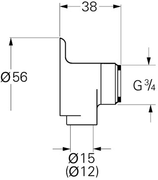 Grohe muurplaat, draadmaat kraanaansluiting 3/4", soldeermofxbuitendraad, haaks, lengte vanaf muurplaat 38mm, behuizing messing, oppervlaktebescherming verchroomd, uitwendige buisdiameter aansluiting 15mm