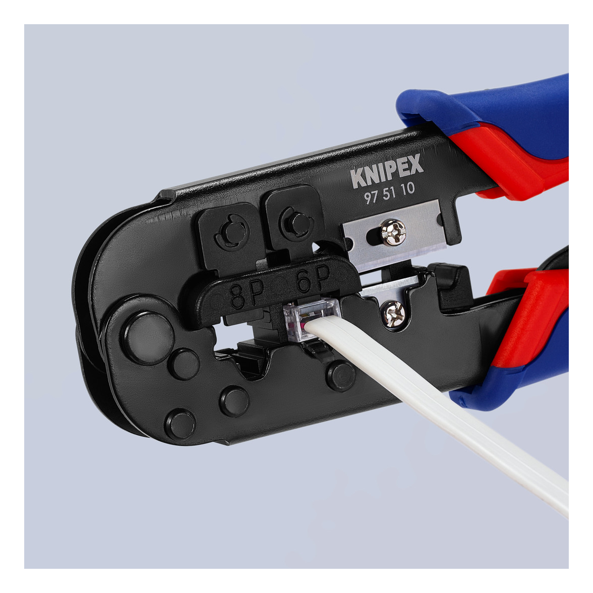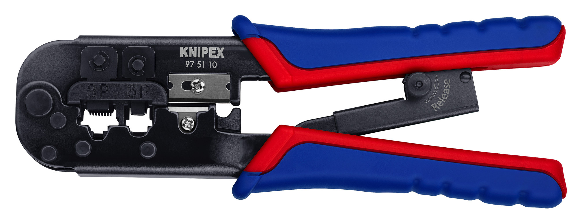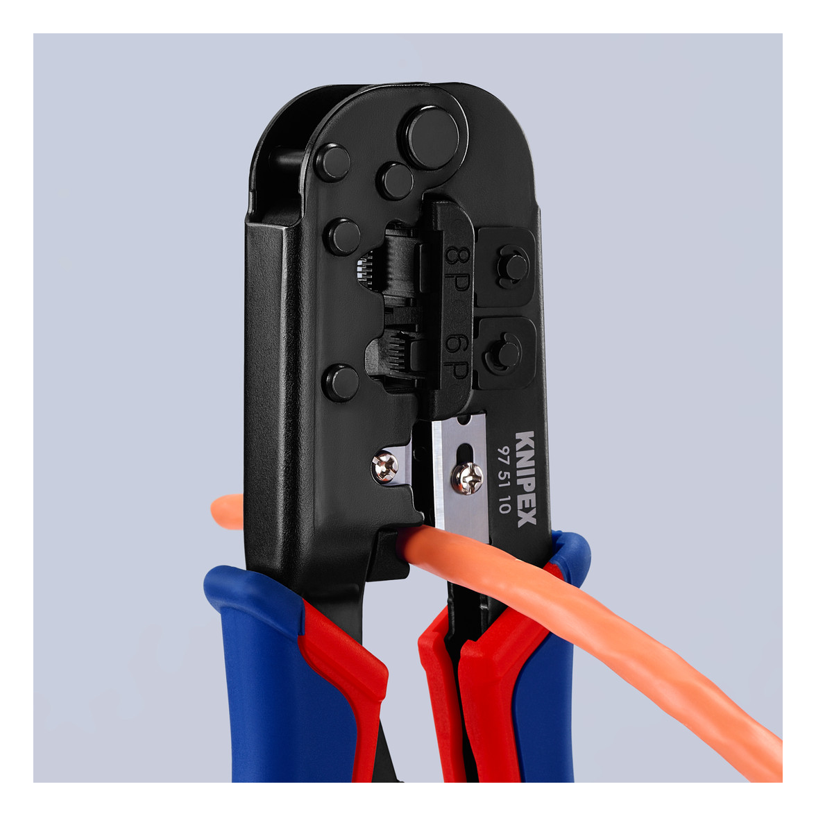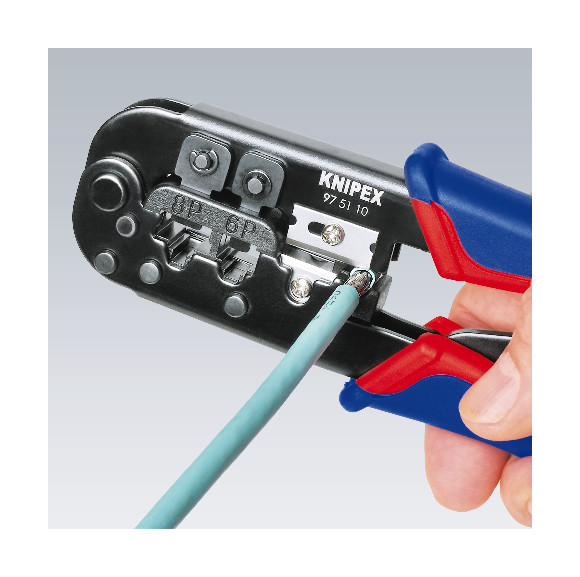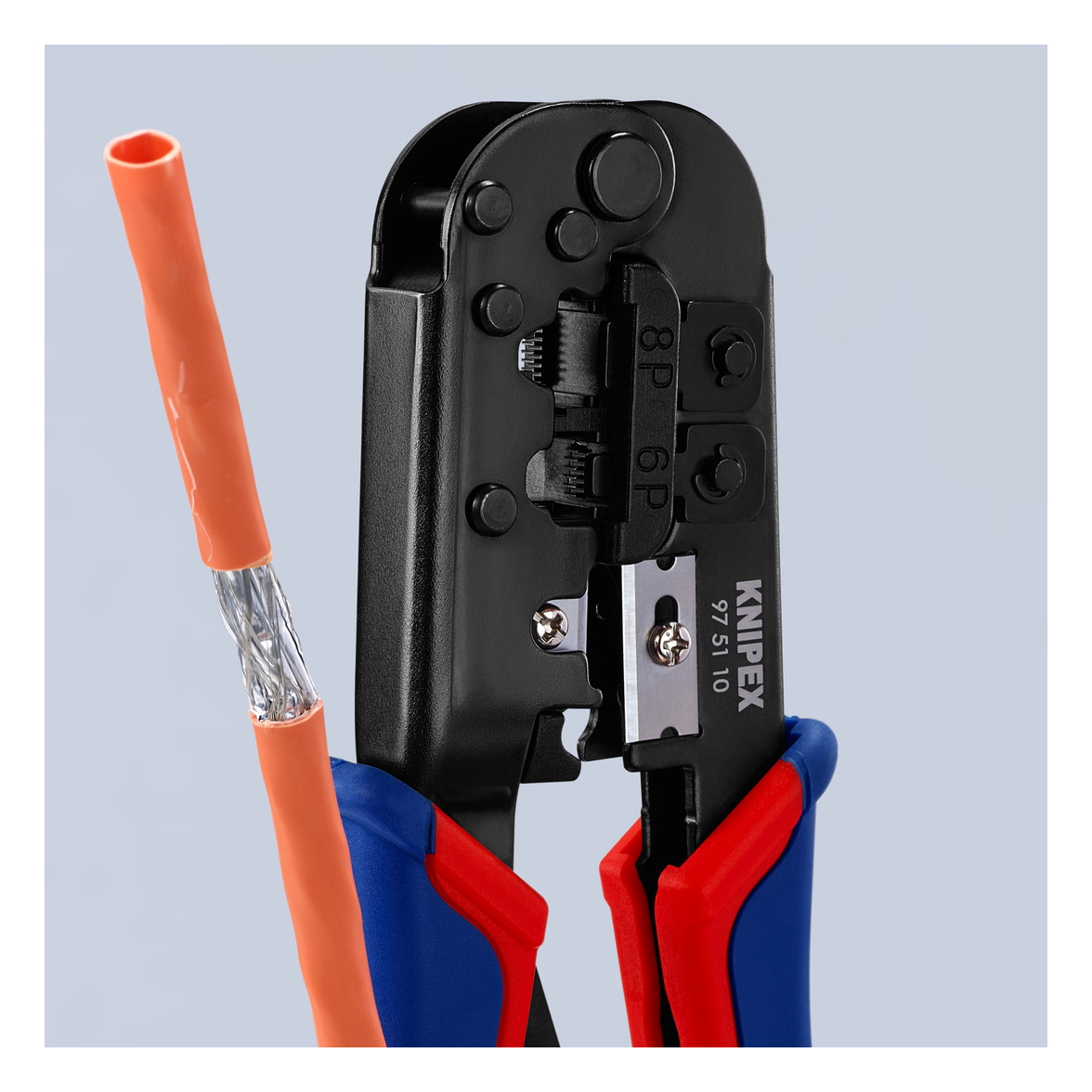 Professioneel gereedschap voor het knippen en strippen van platte, niet-afgeschermde telefoonkabel. Voor het krimpen van 6- en 8-polige Western stekkers van het type RJ 11/12 (9,65 mm breed) en type RJ 45 (11,68 mm breed). Lang ontwerp. Exact krimpproces door parallelle krimp. Constant hoge krimpkwaliteit dankzij positieve vergrendeling (kan worden ontgrendeld). Met lengtesnijder en stripmes voor platte kabels van 6 en 12 mm lengte. Met extra stripfunctie voor ronde kabels.