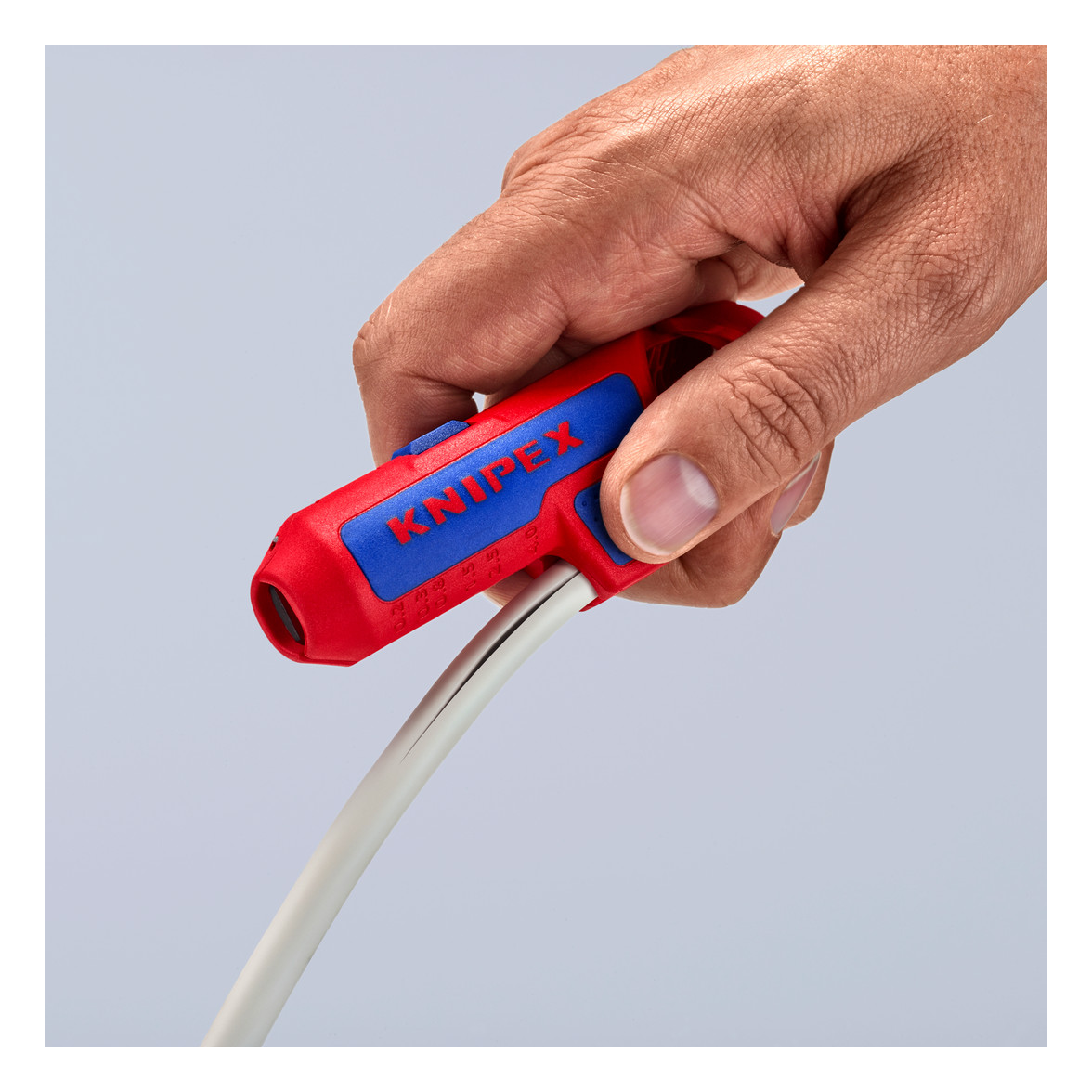 Voor het snel en nauwkeurig strippen en ontmantelen van alle gangbare ronde en natte ruimtekabels (bijv. NYM-kabel 3 x 1,5 mm² tot 5 x 2,5 mm²), datakabels (bijv. twisted pair) en coaxkabels. Innovatief, ergonomisch ontwerp met pistoolgreep voor gemakkelijk inknippen, uittrekken en in de lengte doorsnijden van de mantel. Tapse gereedschapseinden voor betere toegankelijkheid in krappe ruimtes. Stripping apparaat voor doorsneden 0,2 / 0,3 / 0,8 / 1,5 / 2,5 / 4 mm². Vereenvoudigd inbrengen van enkele geleiders voor strippen dankzij positioneerstaven. Met openingsveer en ratel. Gemakkelijk inbrengen van coax- en datakabels dankzij openingshulp. Meer-componenten ontwerp met zachte kunststof zone voor comfortabel hanteren en veilige grip.