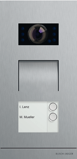 Video-buitenpost met 2 beldrukkers en een frontplaat van 3 mm dik edelstaal (oppervlak geborsteld).