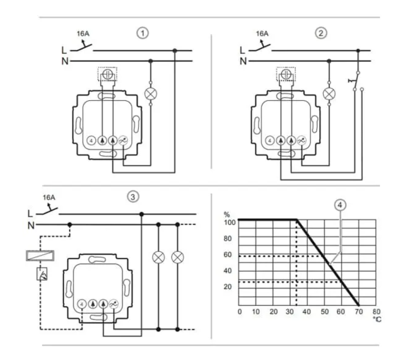 • Voor gloeilampen, 230V-halogeengloeilampen, laagvolthalogeenlampen met conventionele of elektronische transformatoren en dimbare halogeen-energiespaarlampen.