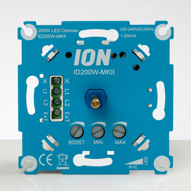 Universele dimmer van Ion Industries voor het dimmen van alle LED verlichting. Halogeen en Gloeilampen van 0 tot 350 Watt. Geschikt voor alle merken frontplaten. Deze LED dimmer is zo te stellen dat deze niet flikkert.