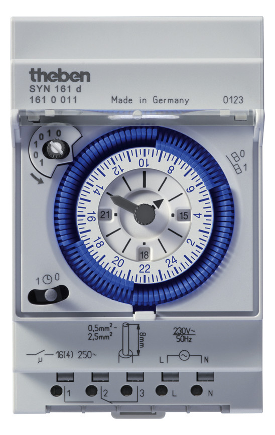 Schakelklok voor DIN-railmontage zonder netspanningsreserve, breedte 52,5 mm, 24-uursprogramma, kortste schakeltijd 15 minuten, wijzers voor tijdweergave en 12u/24u-detectie, tijdcorrectie met de wijzers van de klok mee en tegen de wijzers van de klok in mogelijk, schakelvoorkeuze, handschakelaar met 3 standen: Permanent AAN/AUTO/Permanent UIT, weergave schakeltoestand, DuoFix veerklemmen voor elk 2 geleiders